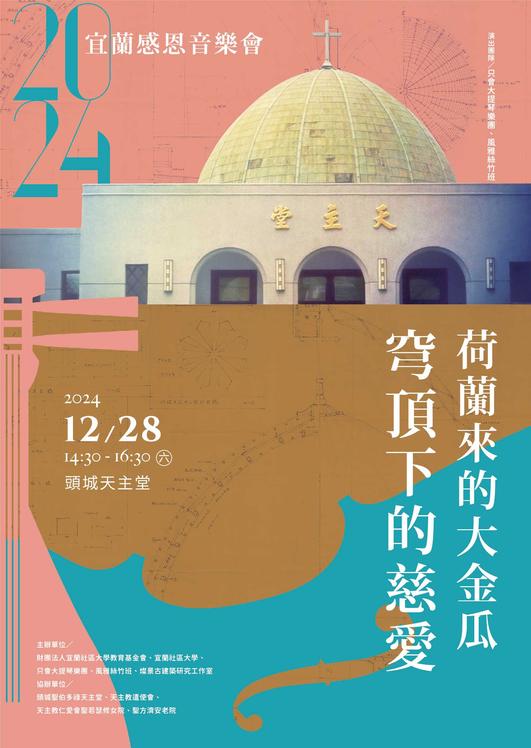 2024年歲末期待在頭城天主堂穹頂教堂裡。在絲竹國樂、大提琴悠揚的音樂與天主堂、文聲復健院、安老院等老照片與故事中,感受近70年來頭城大金瓜下異鄉人慈愛宜蘭的故事。